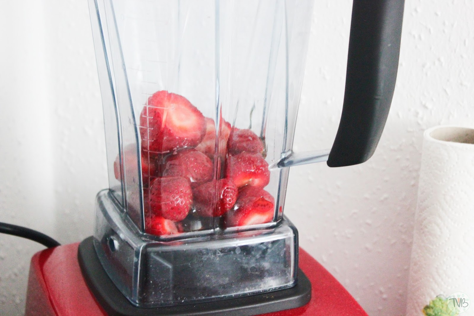 Als erstes wasche ich die Erdbeeren und schneide das Grün ab. Dann gebe ich sie in meinen Mixer, ihr könnt aber auch einen Starb Mixer oder ähnliches zur Hand nehmen. Gebt noch etwas Agaven Dicksaft dazu und mixt sie leicht durch, nicht ganz, so dass noch Stückchen drin sind.