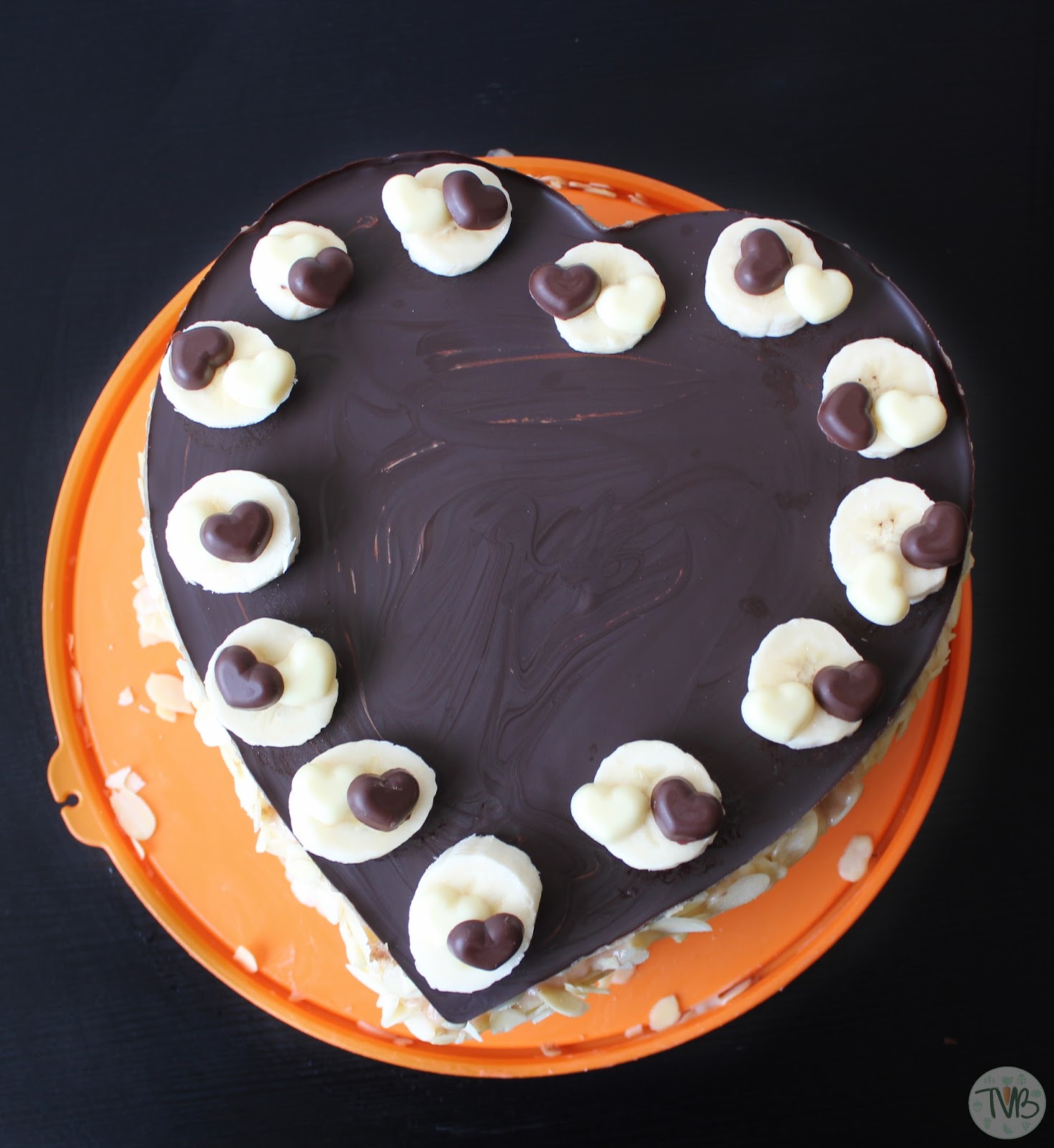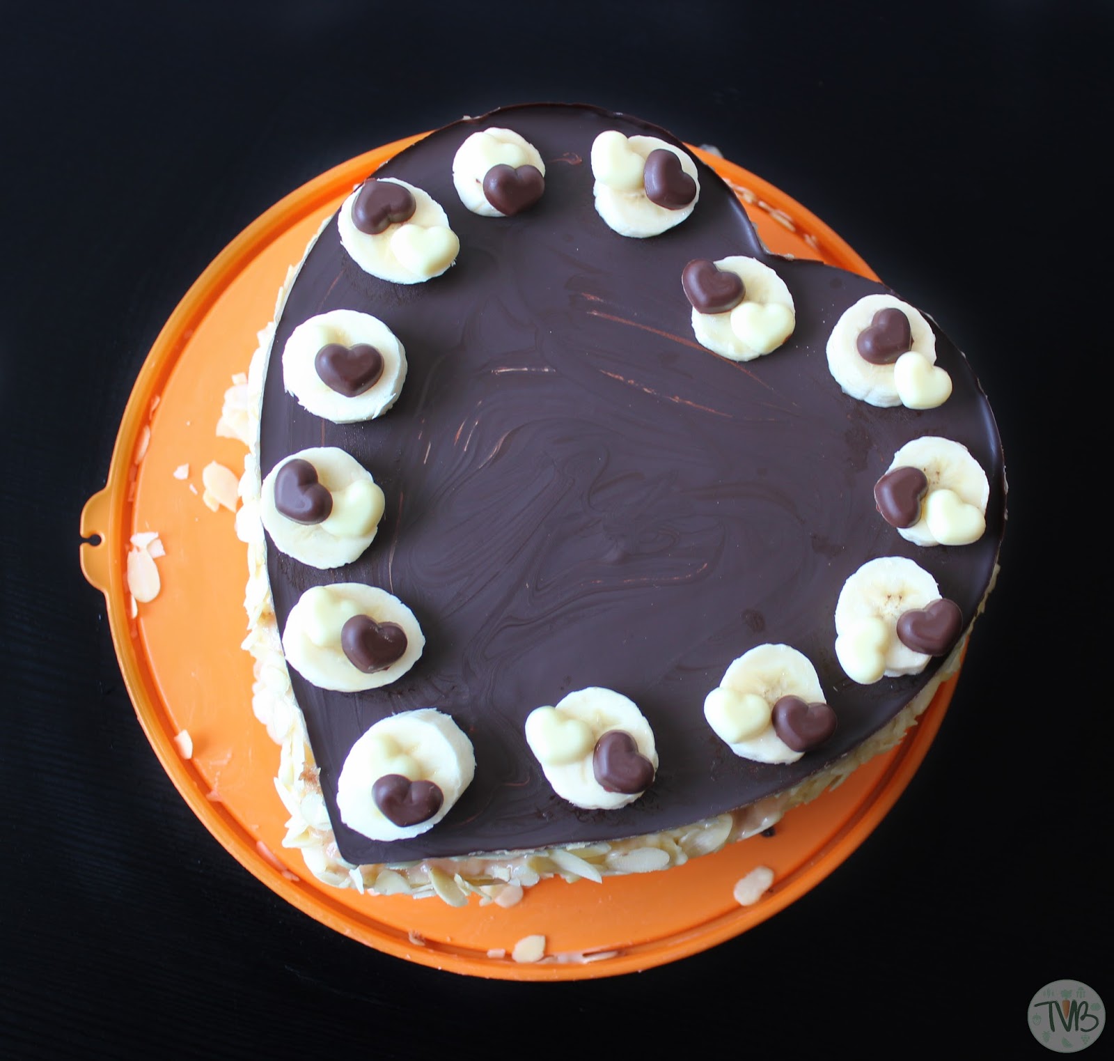 Außerdem habe ich obendrauf noch Bananen und kleine Schokoherzen gegeben. Wer