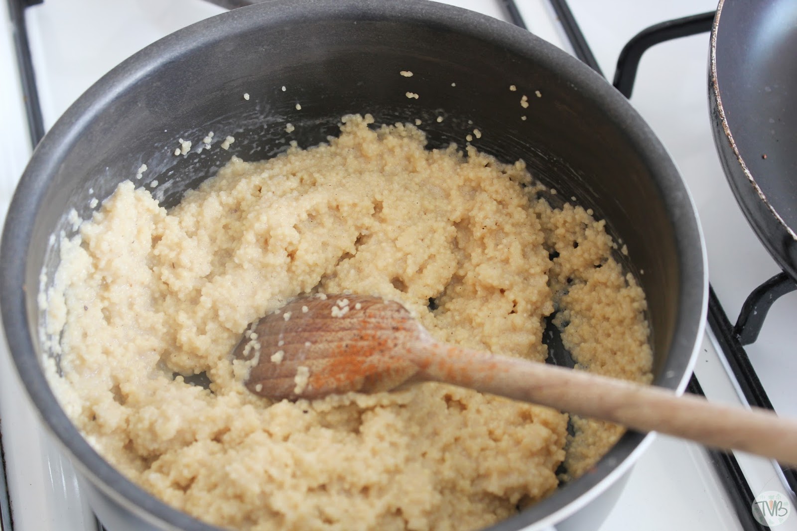 gebt den Couscous hinein. (Da ich einen Gasherd habe und da beim Abdrehen, die Hitze sofort weg ist, lasse ich meinen Topf drauf stehen)