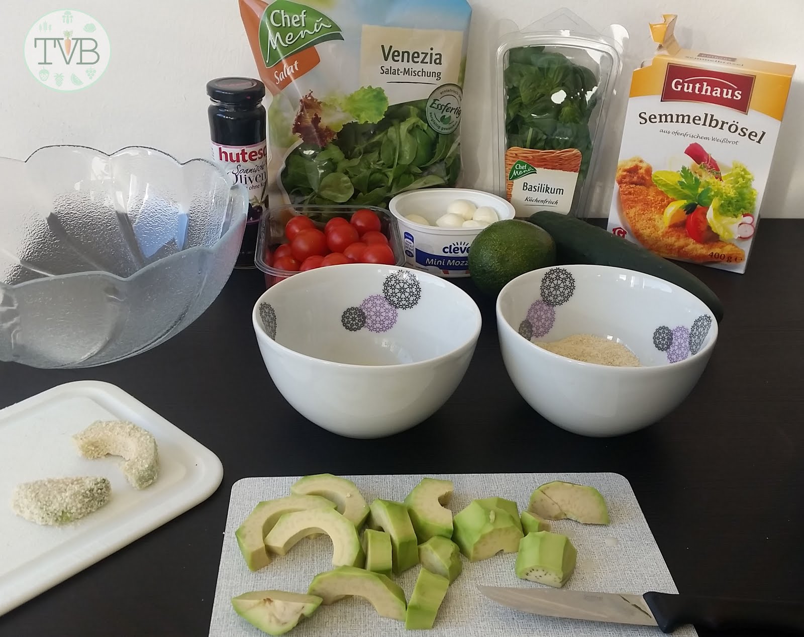 Hier ist mein Ersatz-Rezept für einen „Backhendel-Salat“. Ich ersätze das Huhn einfach durch Avocados.