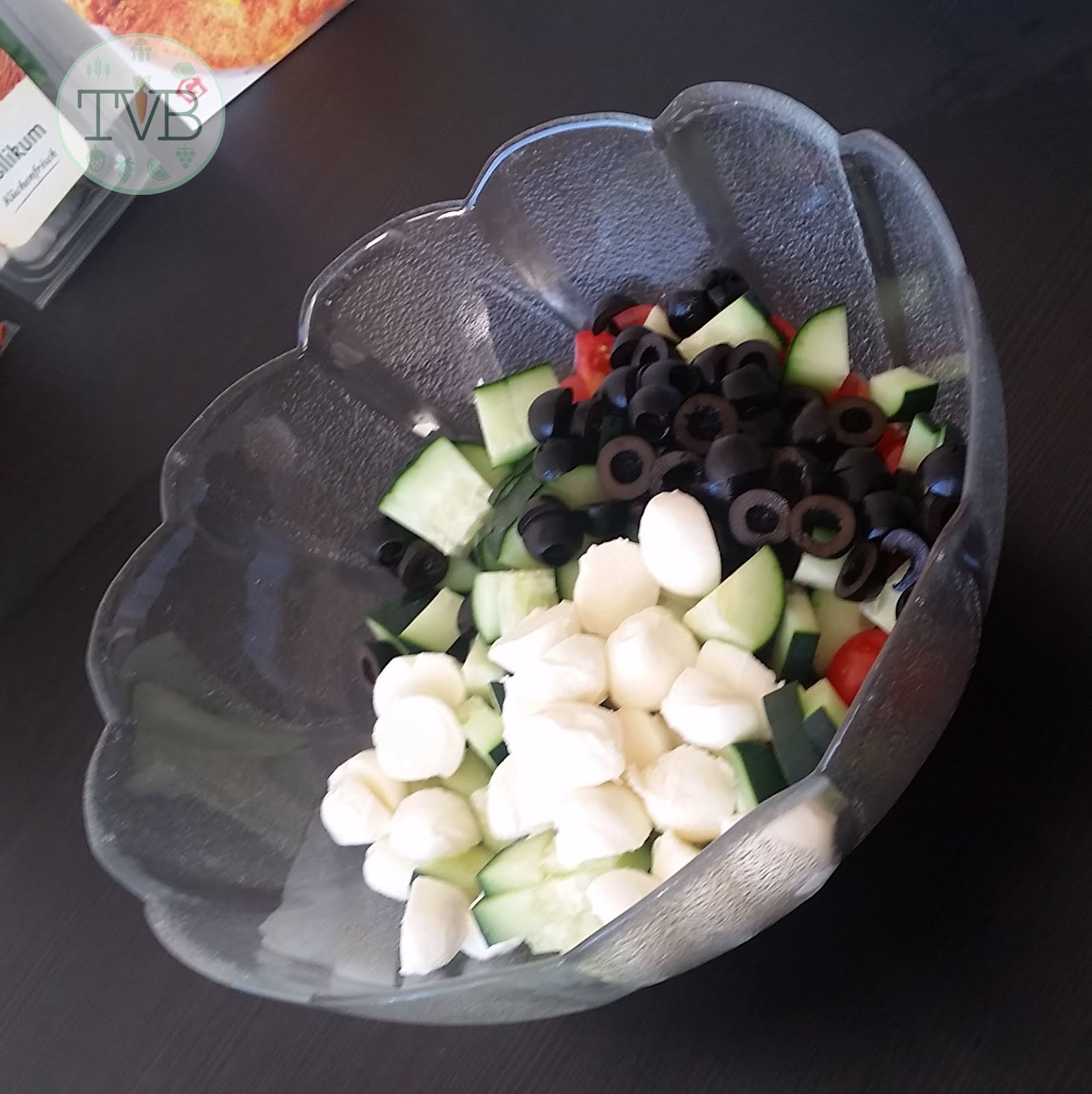 In der zwischen zeit schneide ich mein Gemüse klein. Sowie auch die Oliven und den Mozzarella.