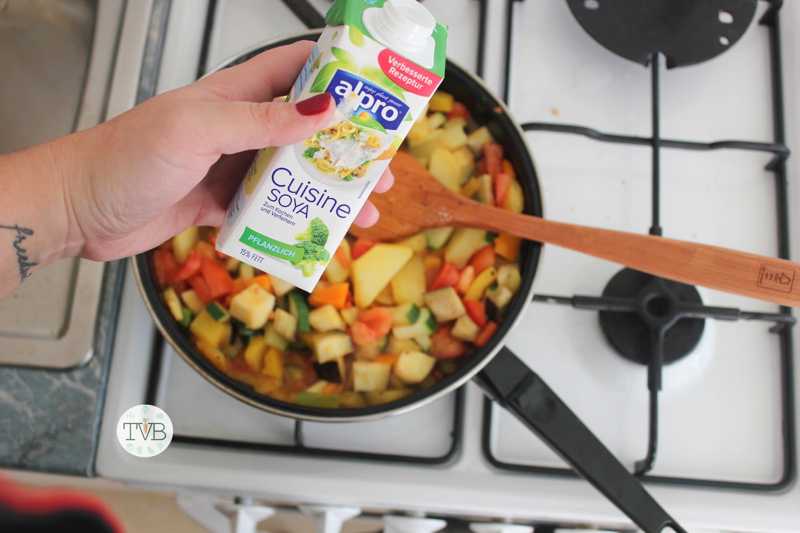 Dann wird mit Sahne abgelöscht und nochmals ordentlich durchgerührt.