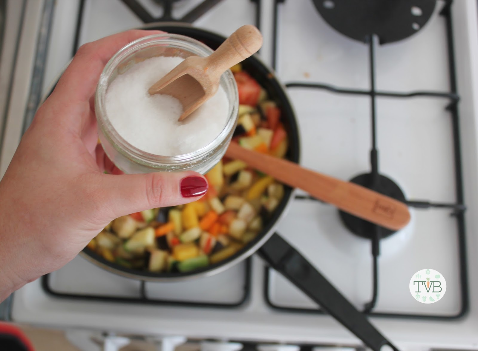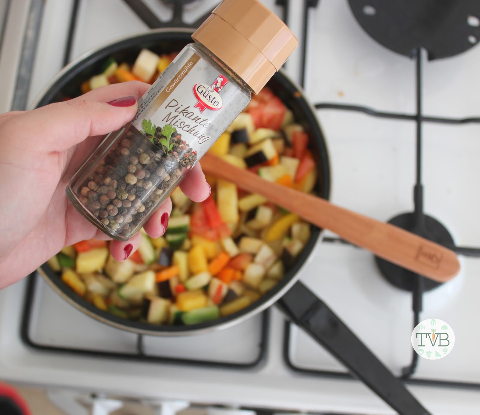 Würzt eure Gemüsepfanne mit Salz und Pfeffer. Rührt alle ordentlich durch.
