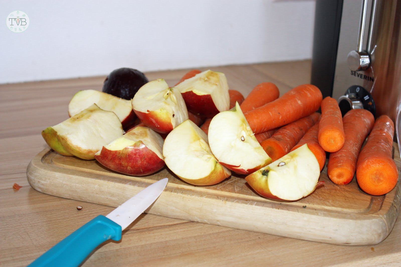 Als erstes schneide ich von den Karotten die Enden ab und Teile die Äpfel in kleinere Stücke.