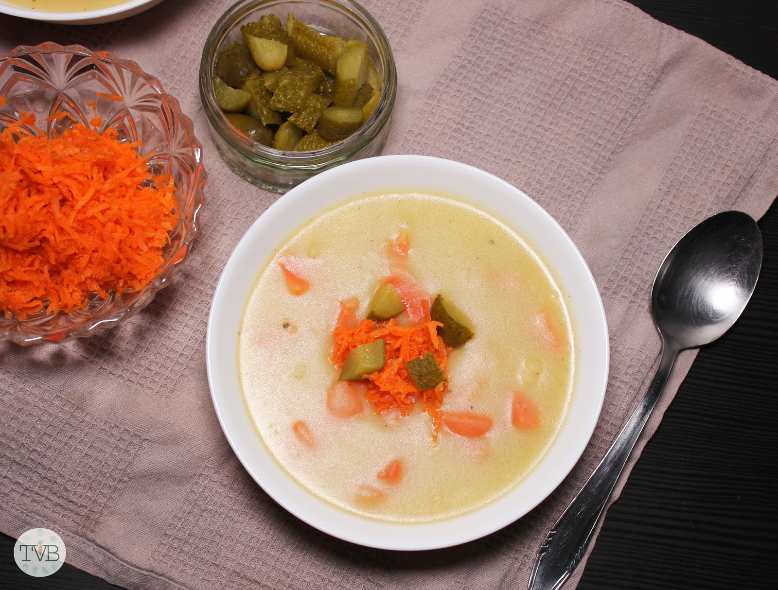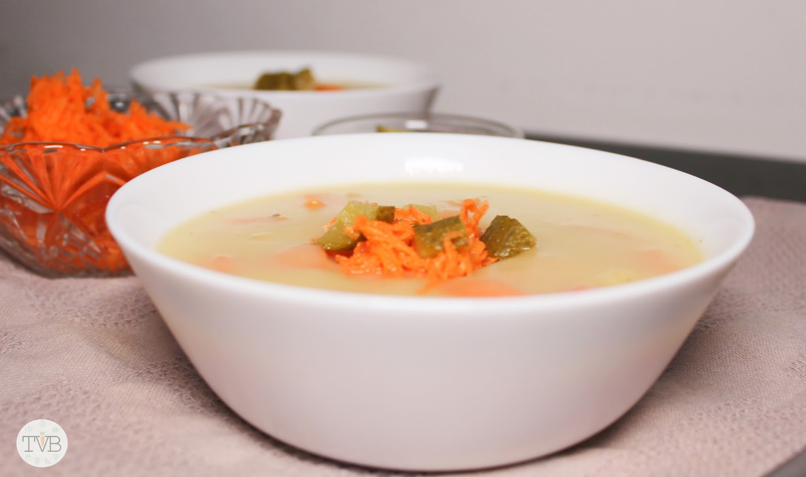 Würzt die Suppe gut ab, und wenn die Karotten weich sind, kann auch schon serviert werden. Bei uns kommen traditionell noch frisch geriebene Karotten und Essiggurken oben drauf.