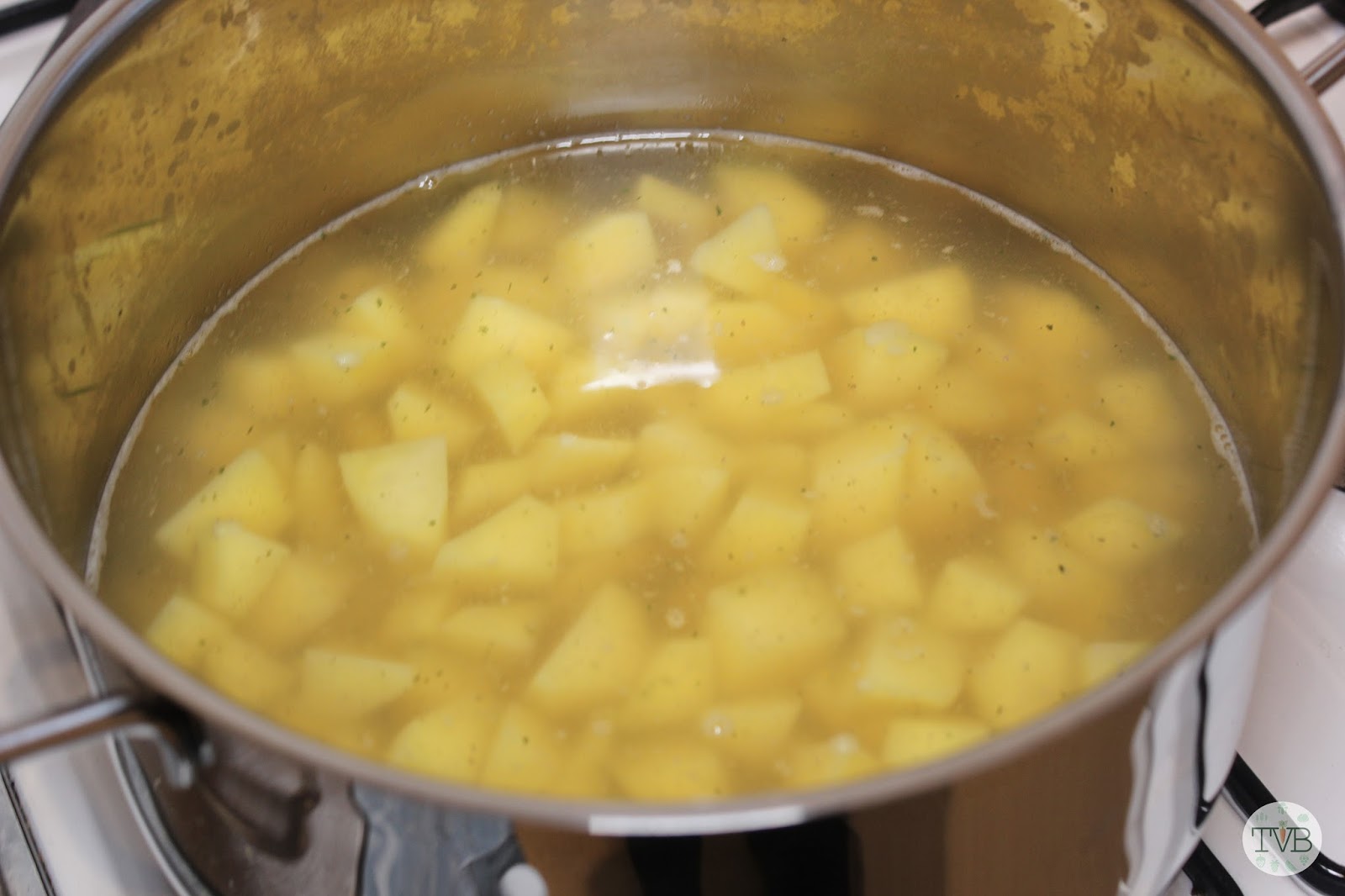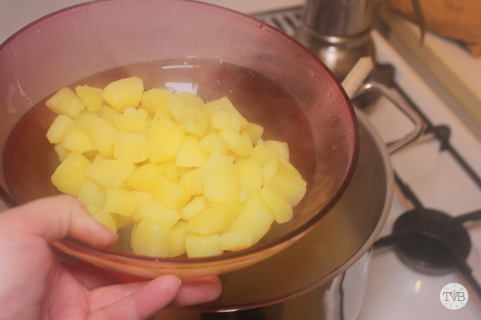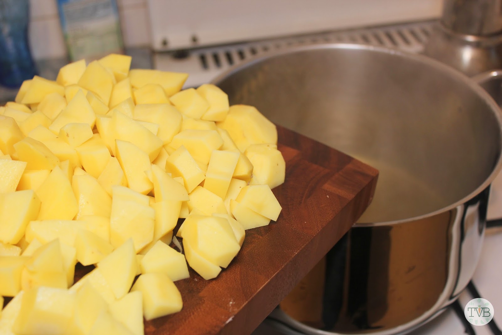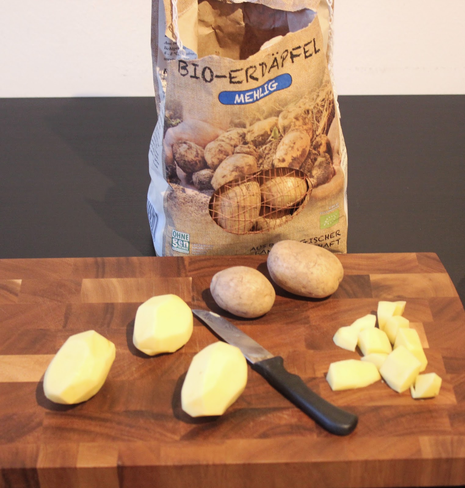 Als erstes müssen die Kartoffel mal geschält und geschnitten werden. In der zwischen Zeit könnt ihr dann auch schon mal die Gemüsebrühe aufsetzen.