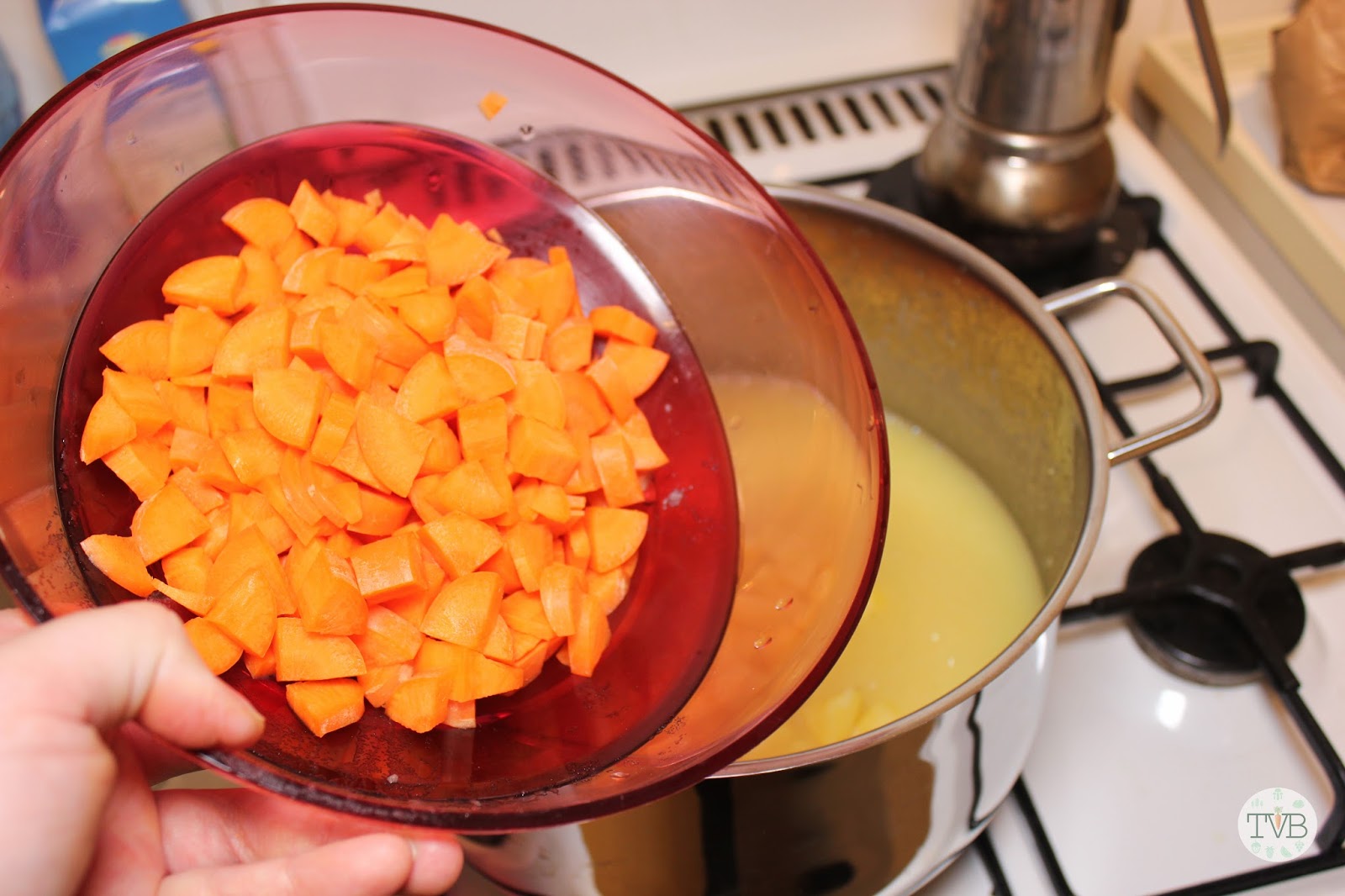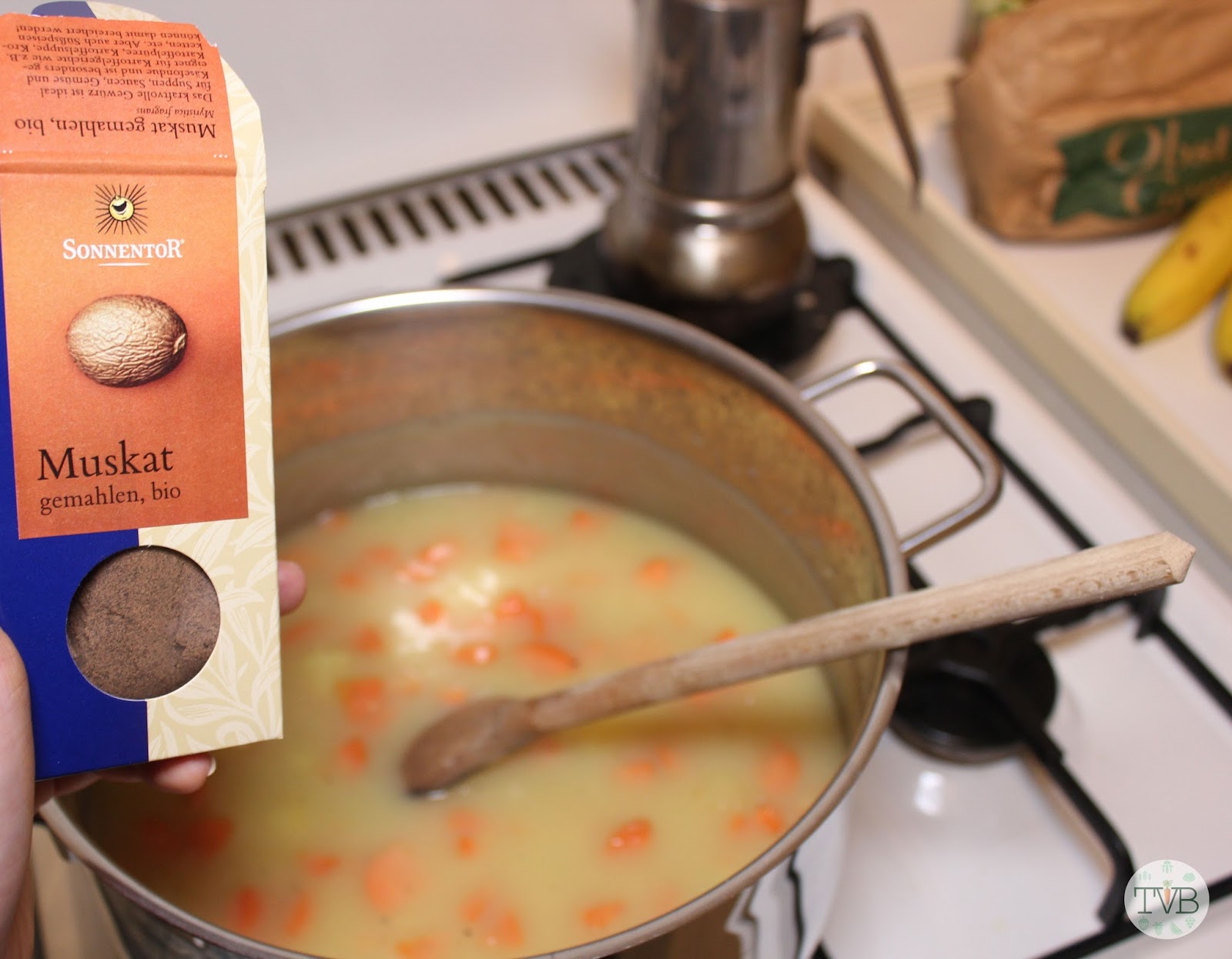 Wenn das ganze schön cremig ist, könnt ihr den Rest der Kartoffeln wieder dazu geben, sowie auch die Karotten. Außerdem füge ich noch etwas Reis-Cuisine dazu um das ganze noch cremiger zu machen.