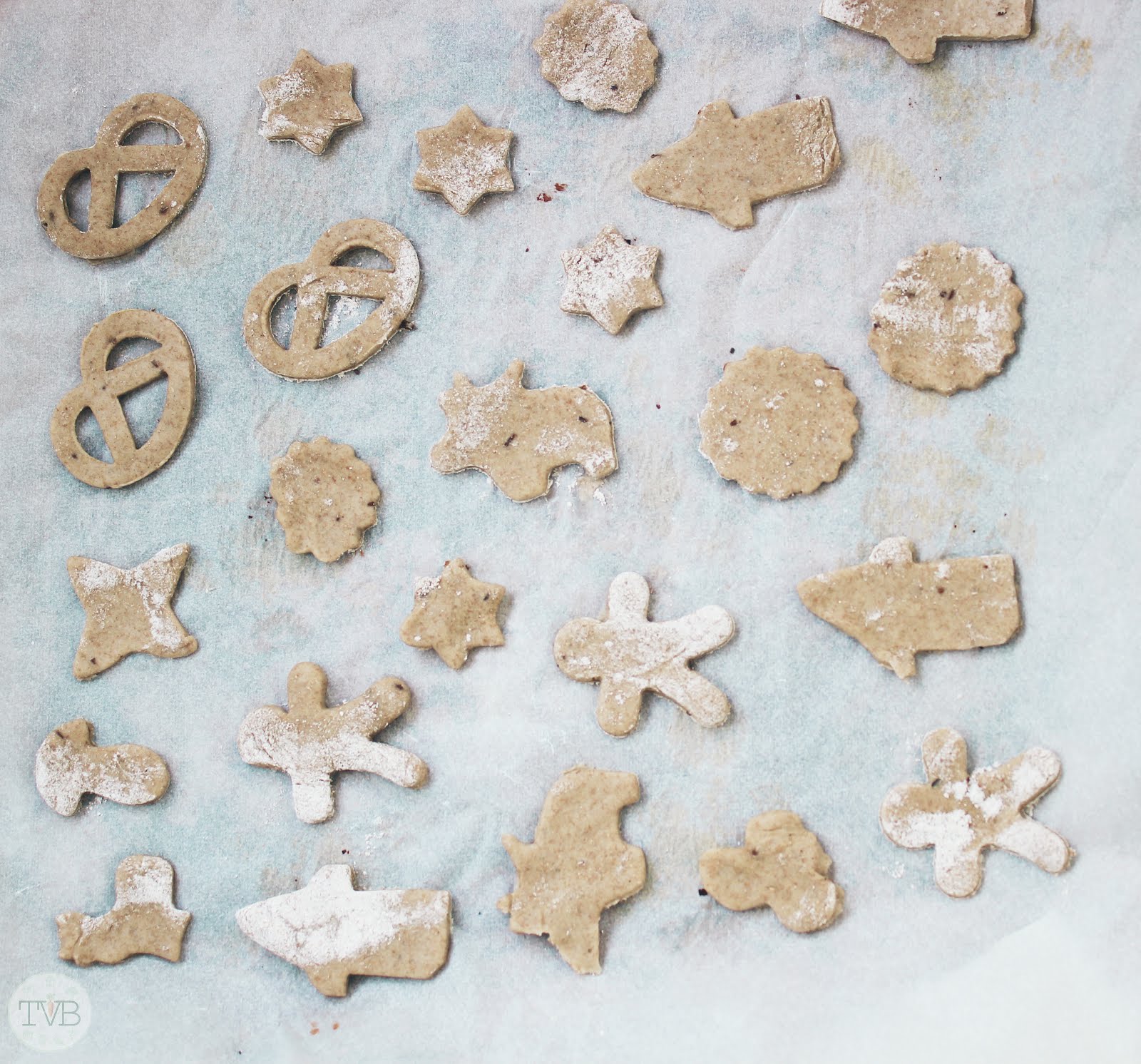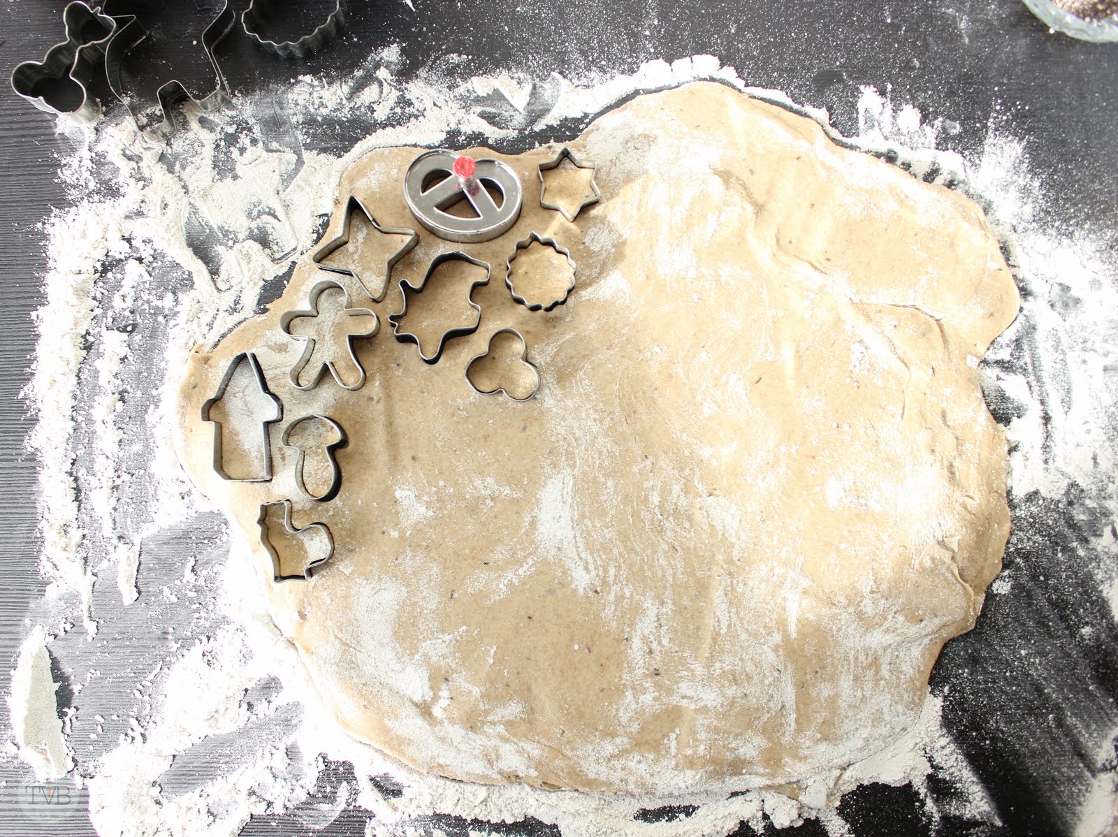 Abgedeckt ca. 30 Minuten an einem warmen Ort gehen lassen. Dann den Teig ca. 3mm dünn/dick ausrollen und mit den Keksausstechern ausstechen.