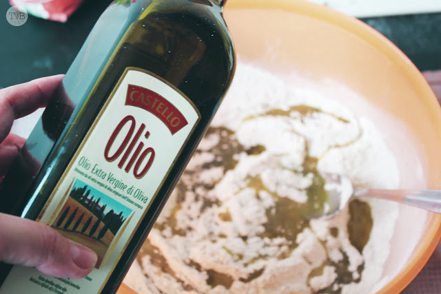Zum Mehl kommt das Öl hinzu. Dann das Wasser mit der Hefe und alles gut zu einem schönen Teig zusammen kneten.