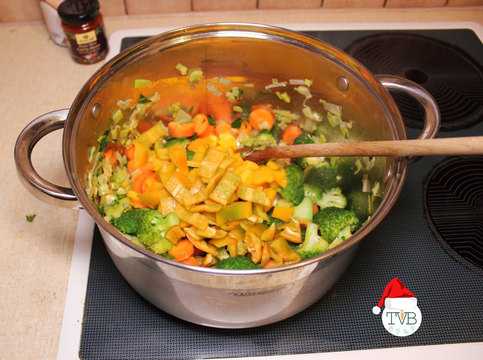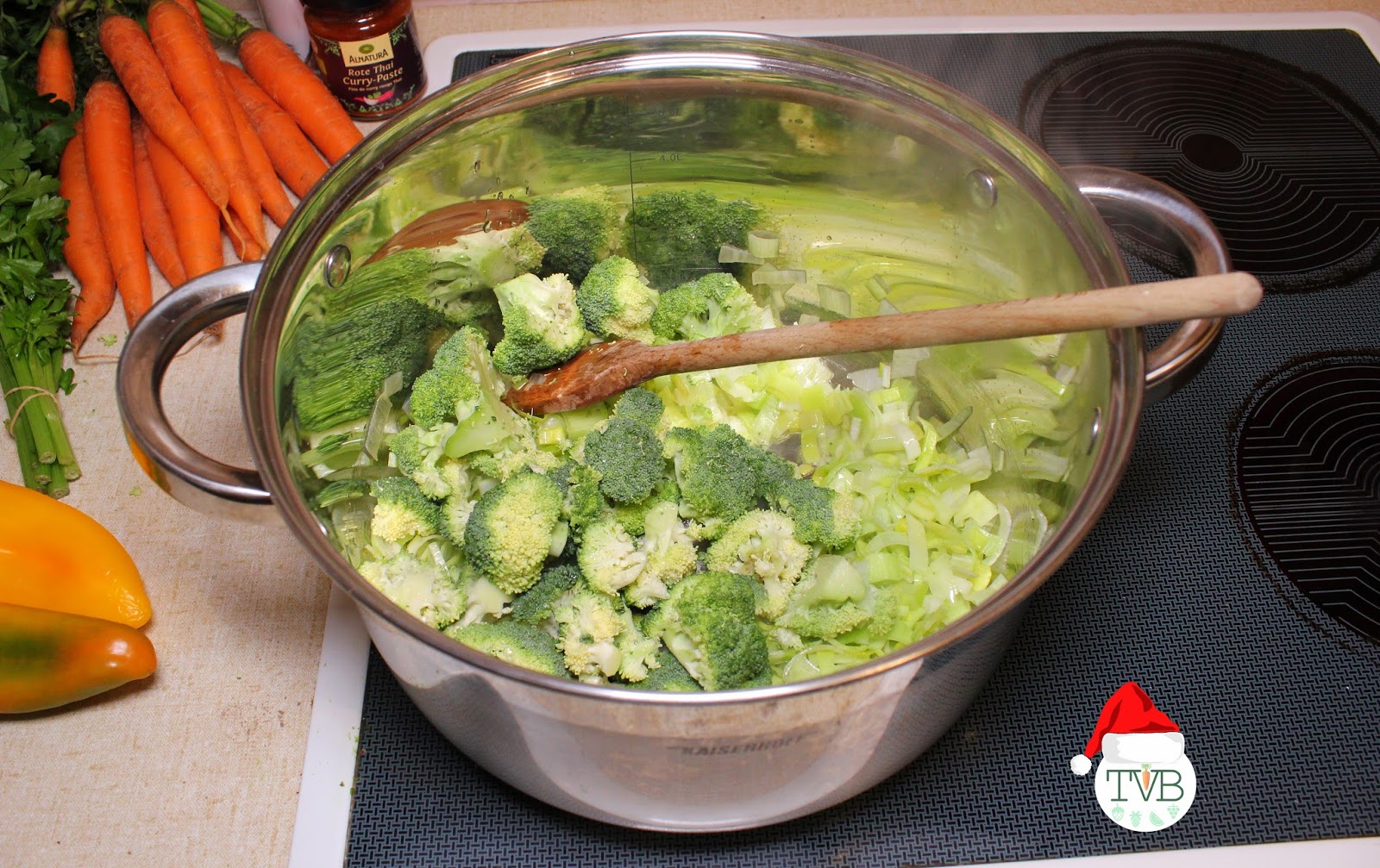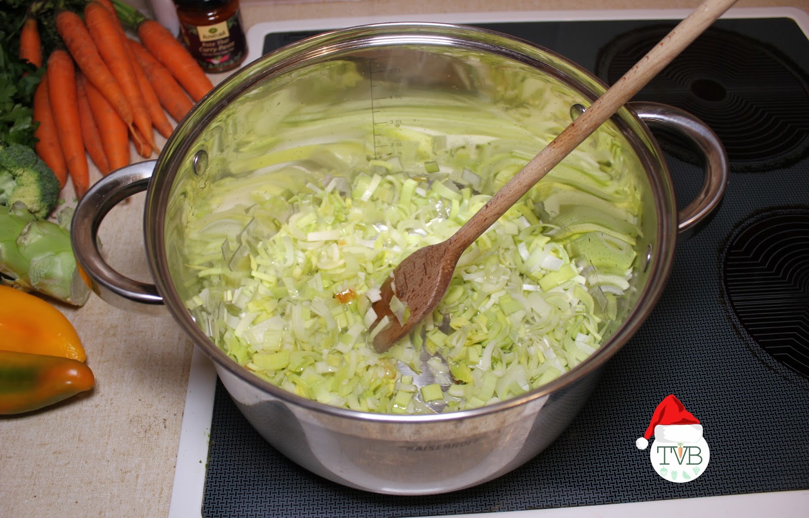Angefangen mit dem Öl geben wir nach und nach das Gemüse in den Topf (geputzt und geschnitten). Wichtig ist die Reihenfolge, als erstes das Gemüse das am längsten braucht, bis zu dem das am schnellsten weich wird.