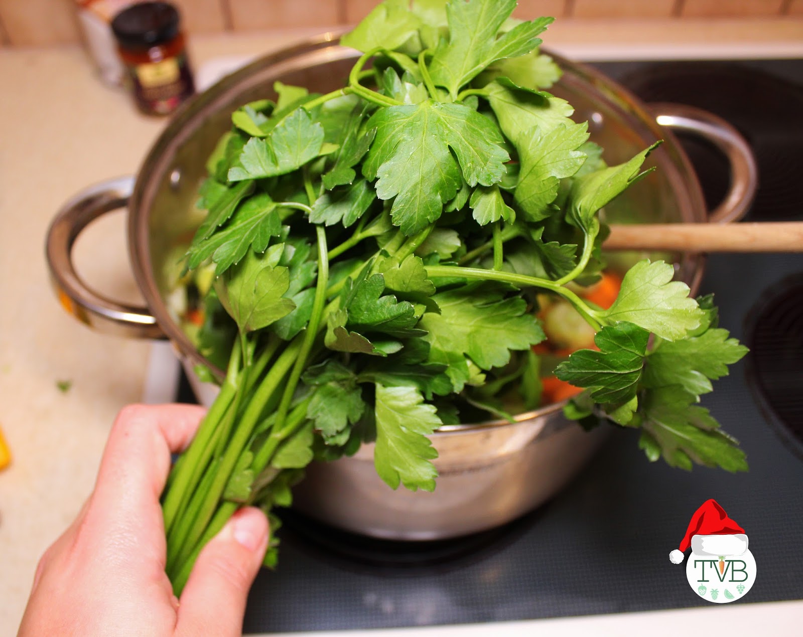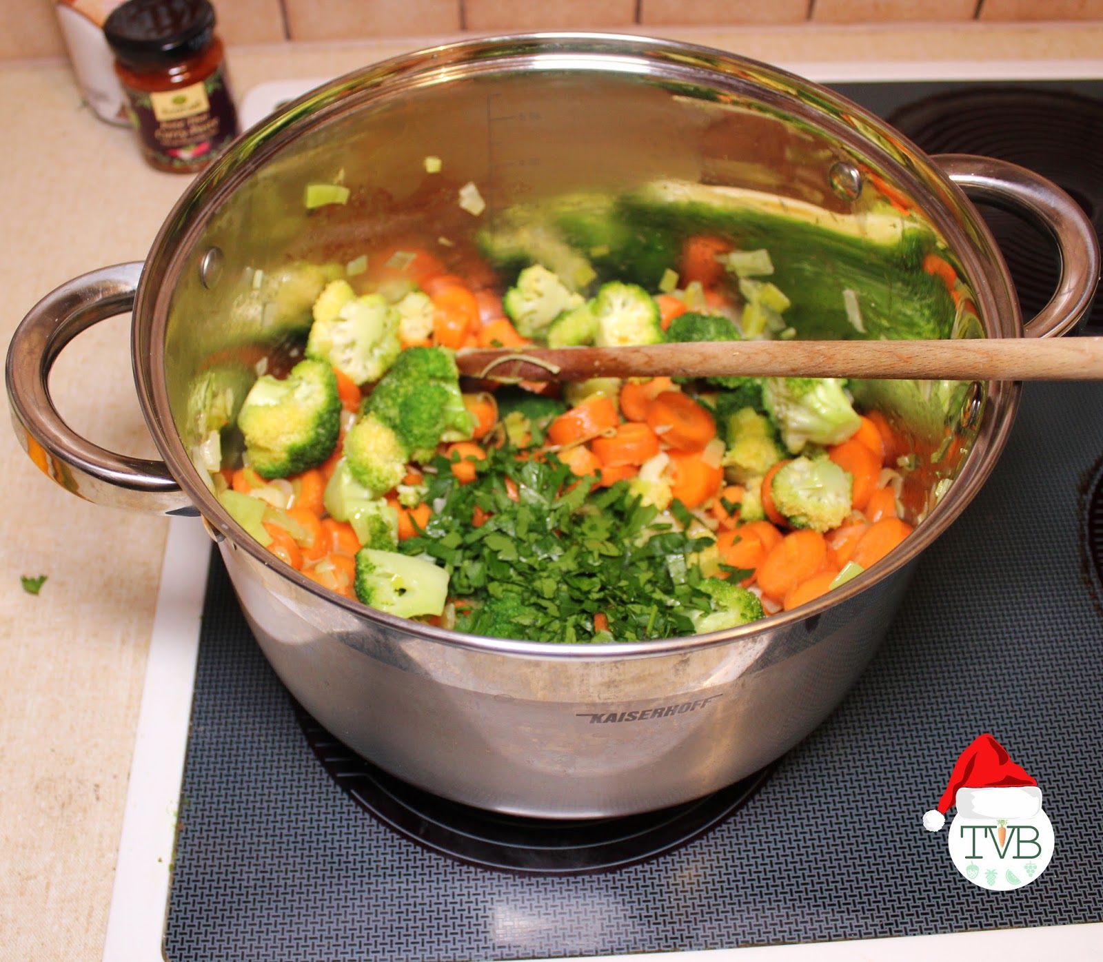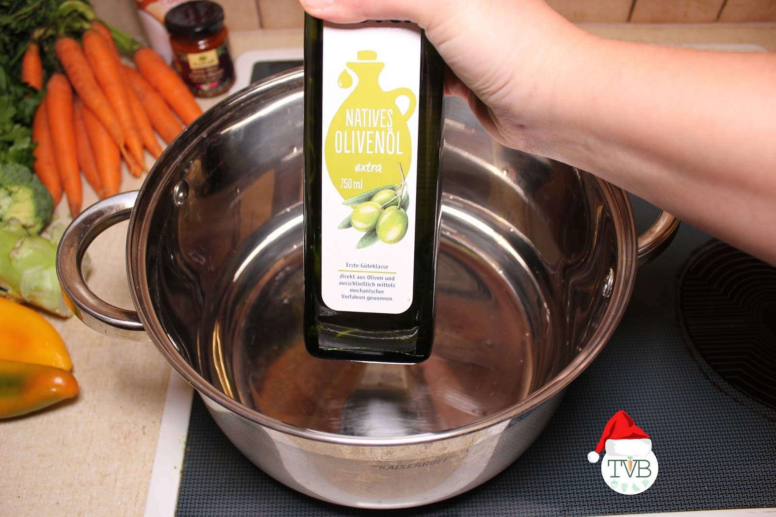 Angefangen mit dem Öl geben wir nach und nach das Gemüse in den Topf (geputzt und geschnitten). Wichtig ist die Reihenfolge, als erstes das Gemüse das am längsten braucht, bis zu dem das am schnellsten weich wird.