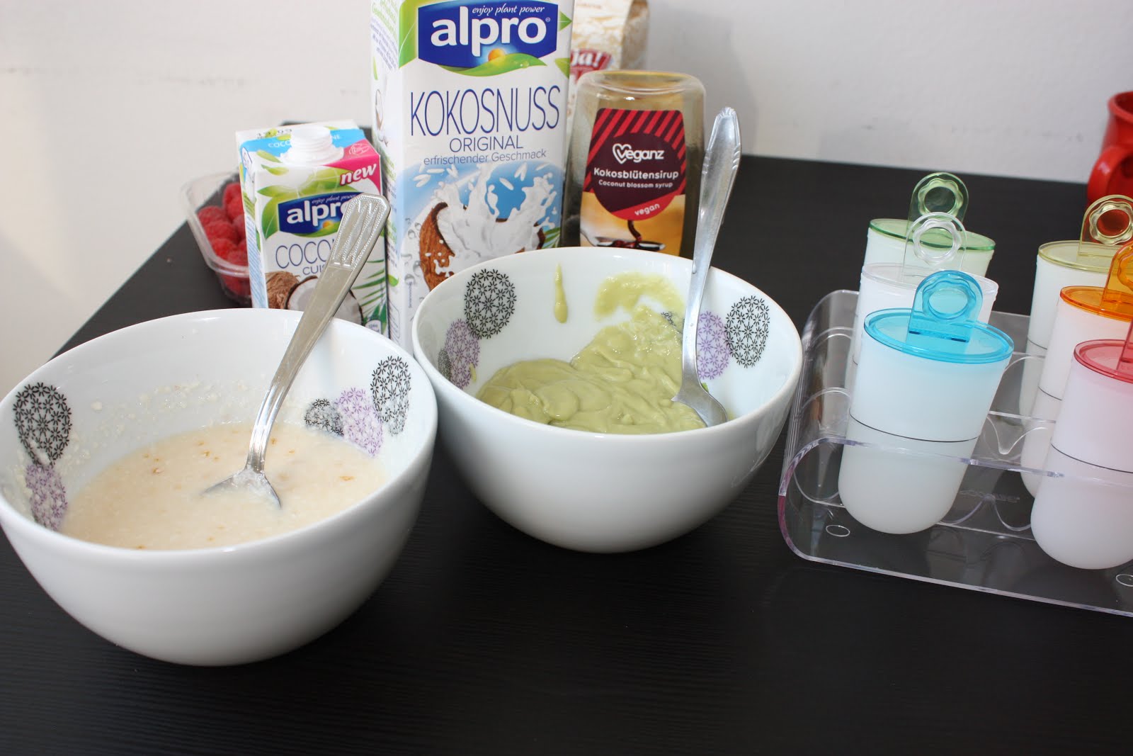 Als Erstes habe ich die Avocado entkernt und fein gestampft, dann mit Cocosine vermischt. In einer zweiten Schüssel habe ich die Kokosmilch mit dem Kokoset angerührt. Gesüßt hab ich hier eigentlich gar nicht, weil ich finde dass die Zutaten schon recht süß sind.