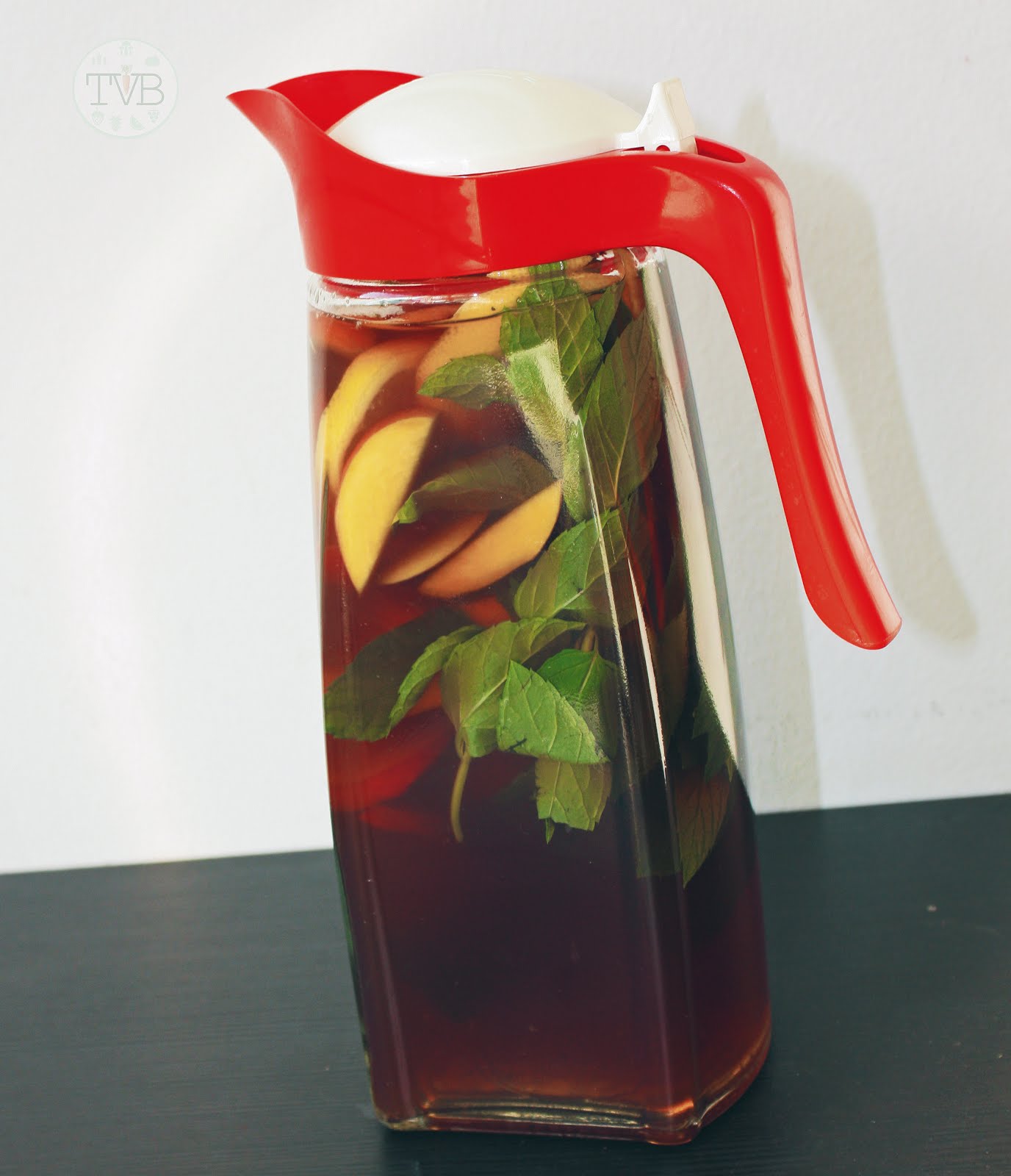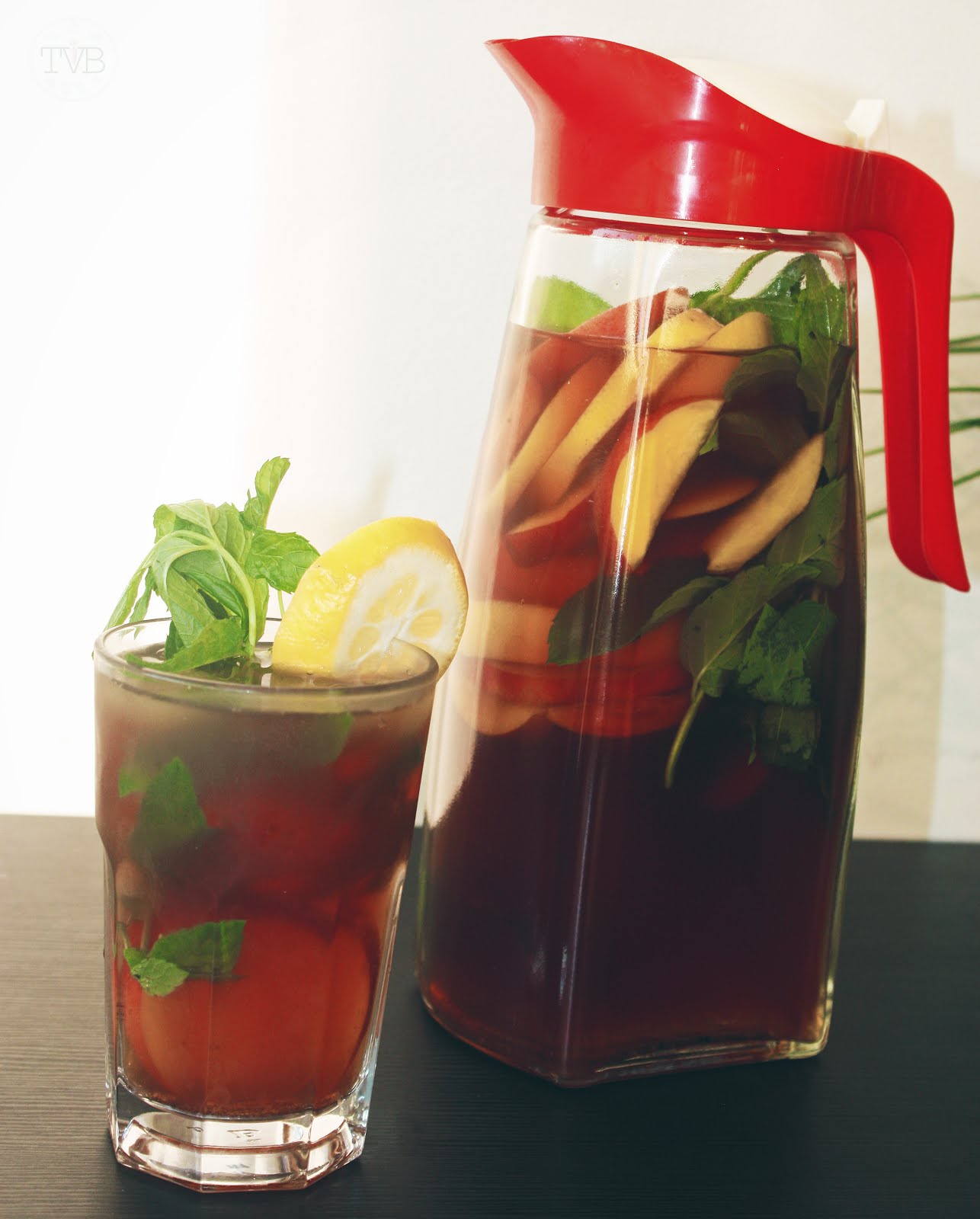 In den Krug gebe ich Minze Zitronenscheiben und die geschnittenen Pfirsiche, dann gieße ich alles mit dem mittlerweile kaltem Tee auf. Das ganze gebe ich nun für ein paar Stunden in den Kühlschrank, dann kann der Eistee erstens noch nachziehen und zweitens wird er auch ohne Eiswürfel schön kalt.
