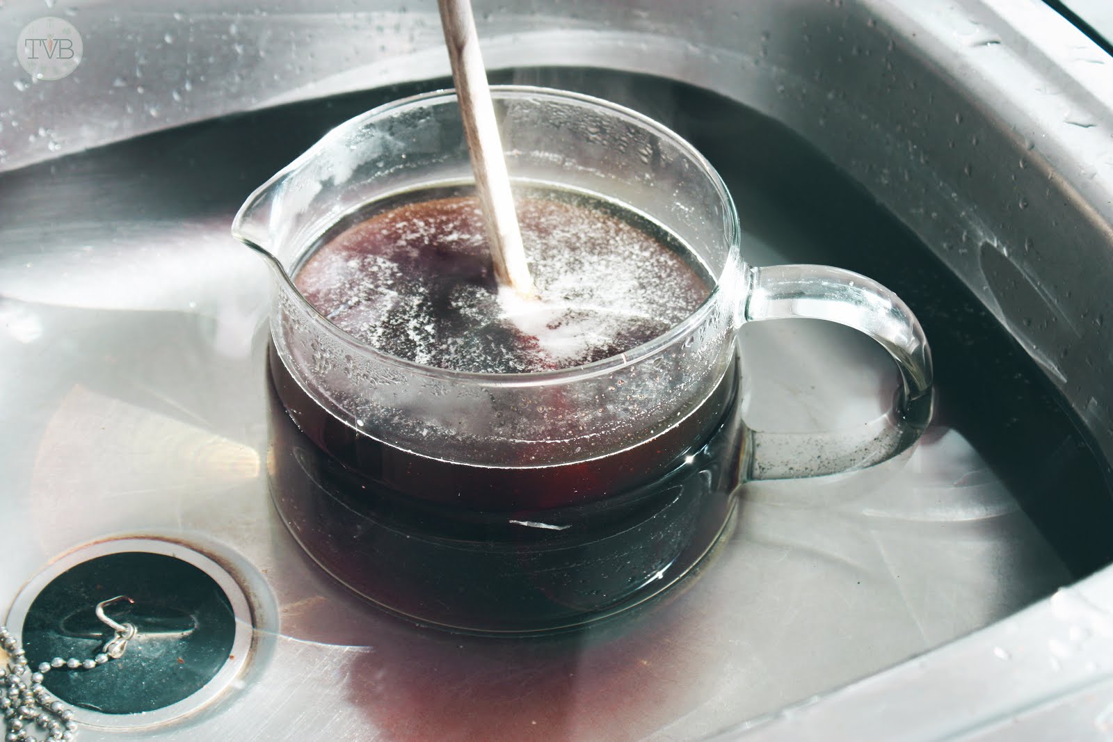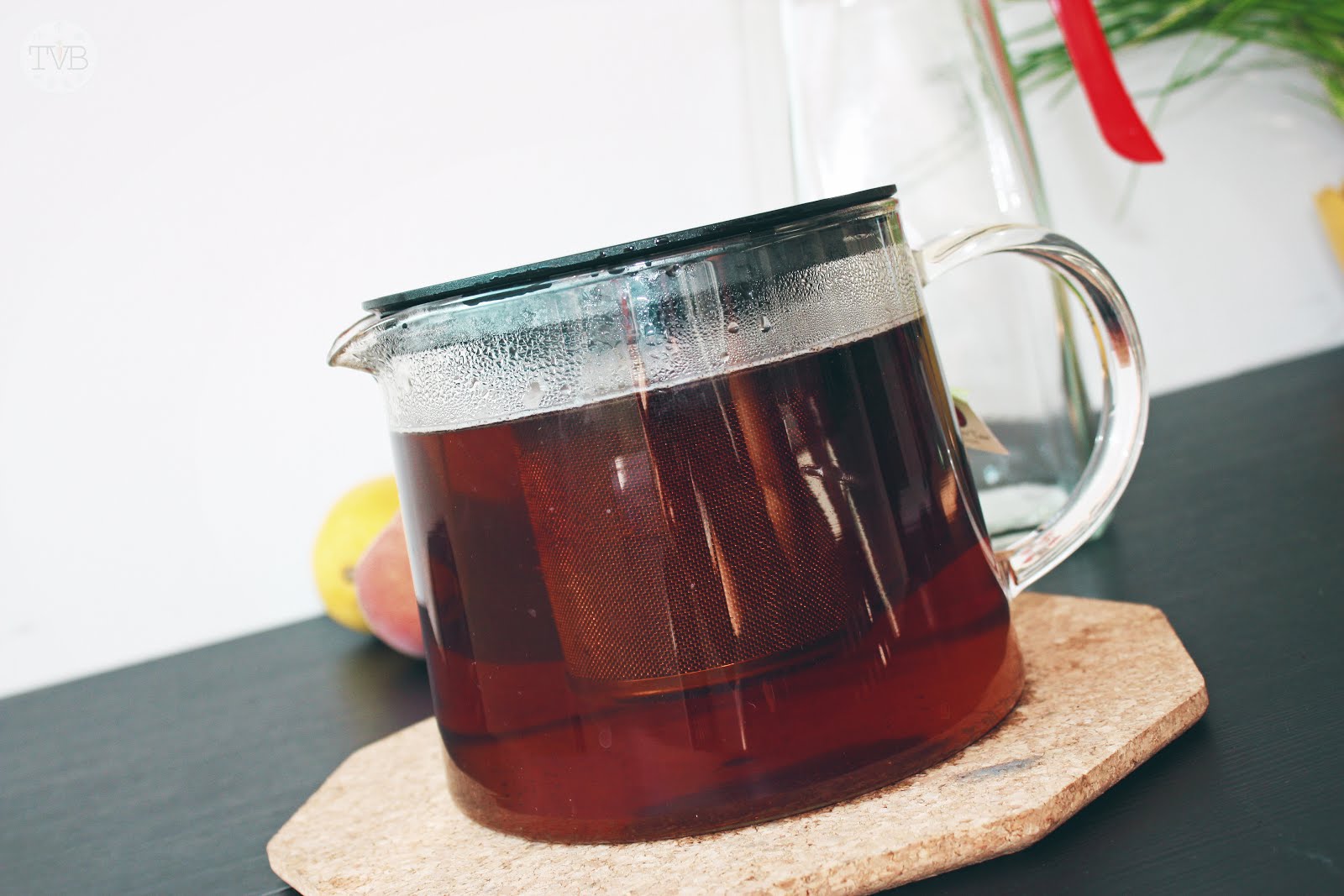 Als erstes müssen wir den Tee kochen, ich mach das in meiner Teekanne, da ich losen Schwarztee benutze und meine Kanne ein Teesieb dabei hat. Ich hänge die Beutel hinein und gebe den Losen Tee in das Sieb. Dann gieße ich alles mit heißem Wasser auf.
