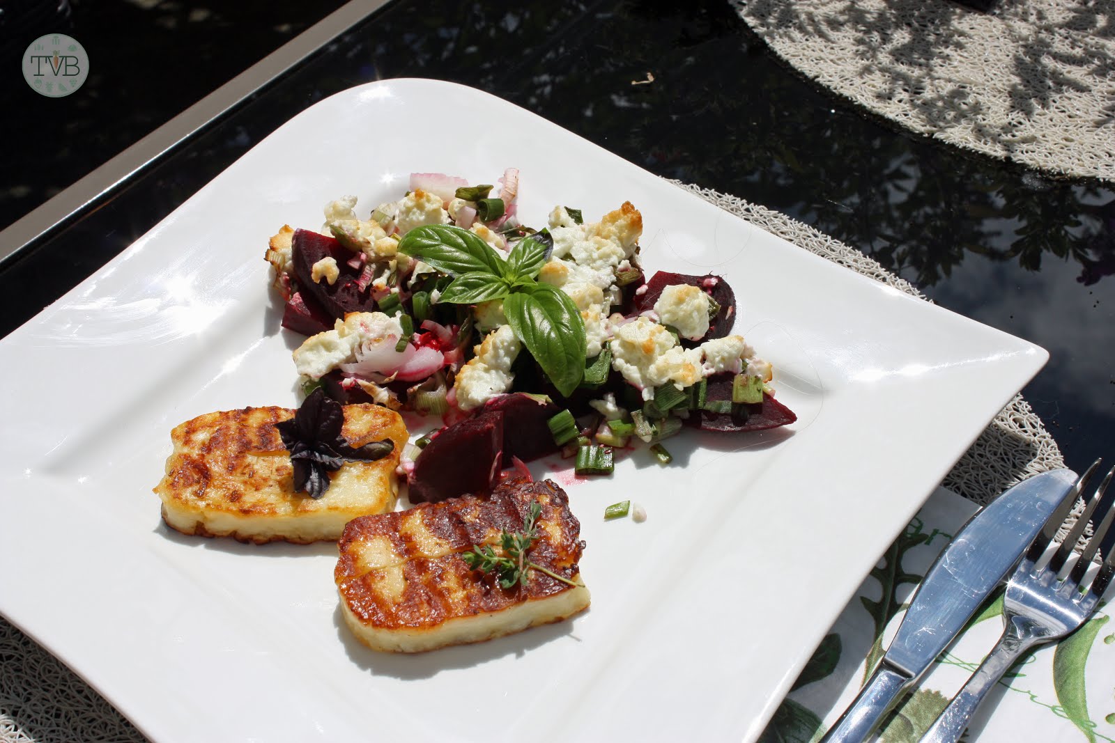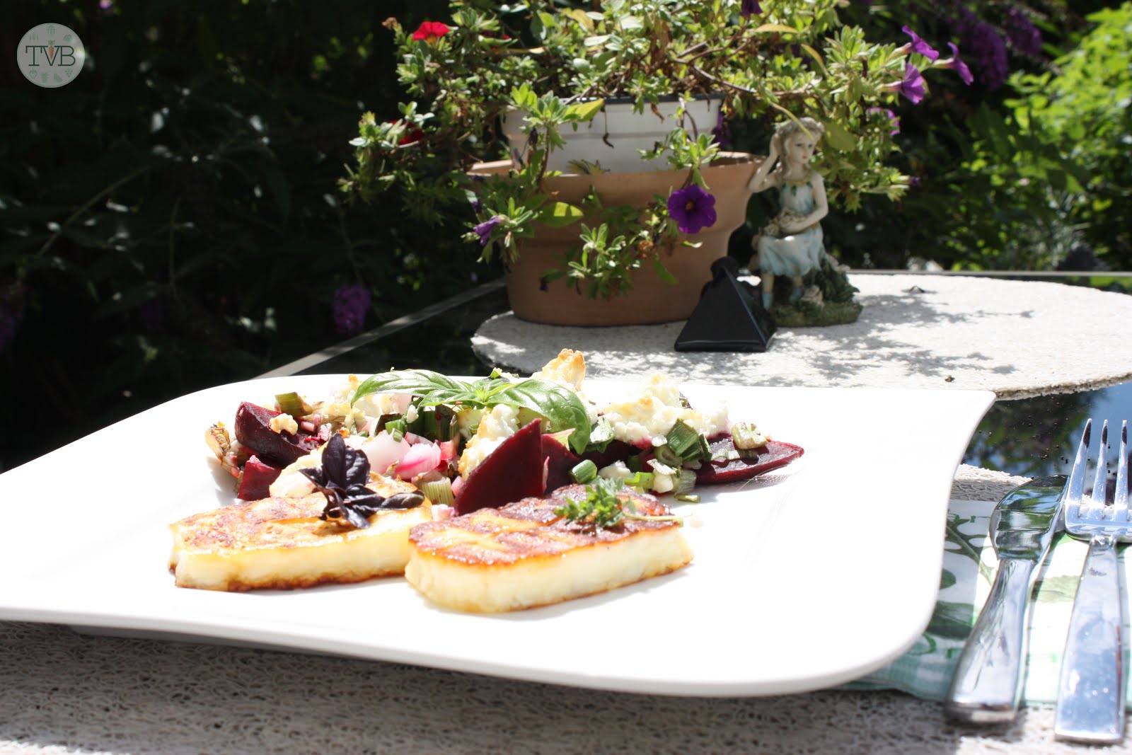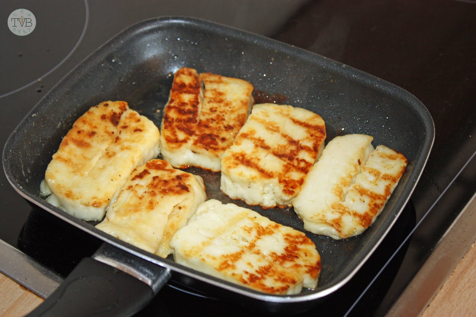 Inzwischen braten schneiden wir den Halloumi und braten ihn auf beiden Seiten Gold/Braun.