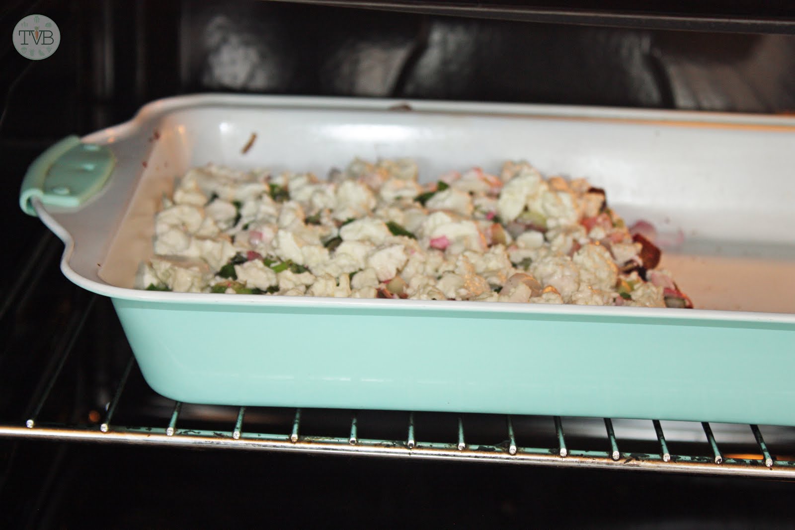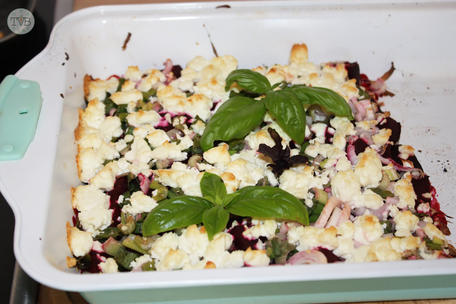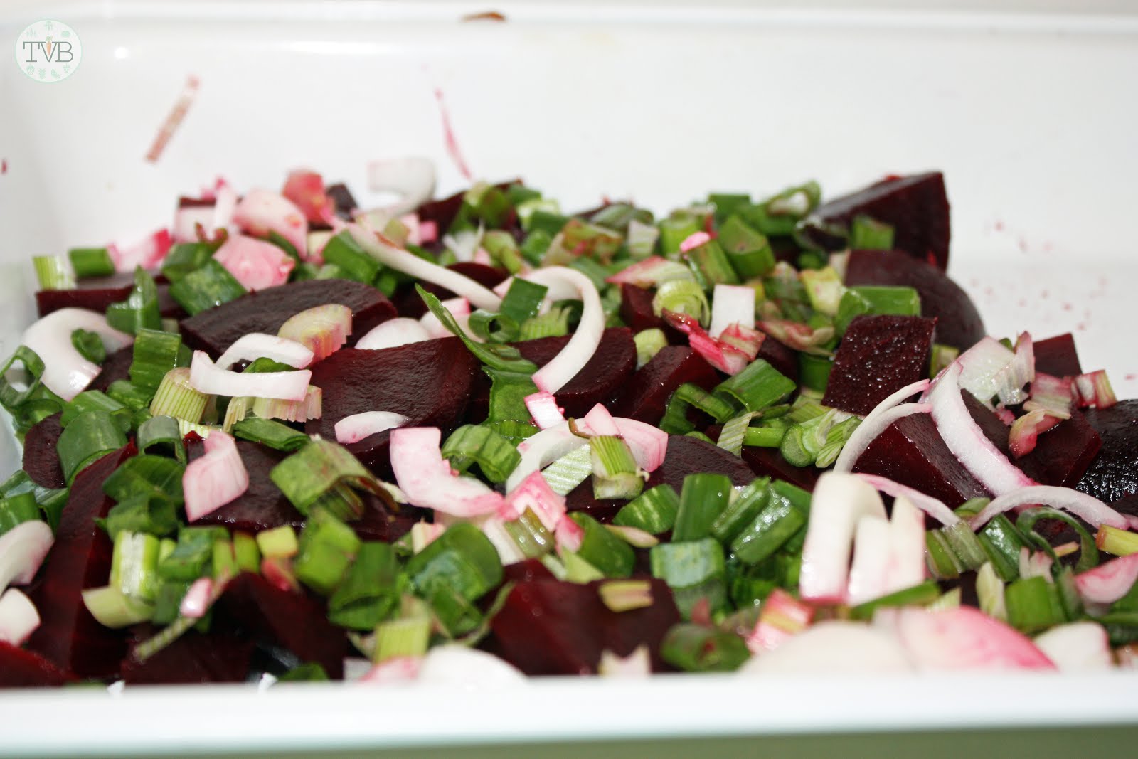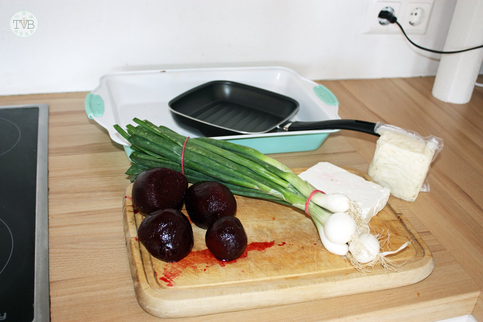 Als erstes die Roten Rüben klein schneiden und in die Auflaufform geben. Dann den Frühlingszwiebel schneiden und auch darüber geben.