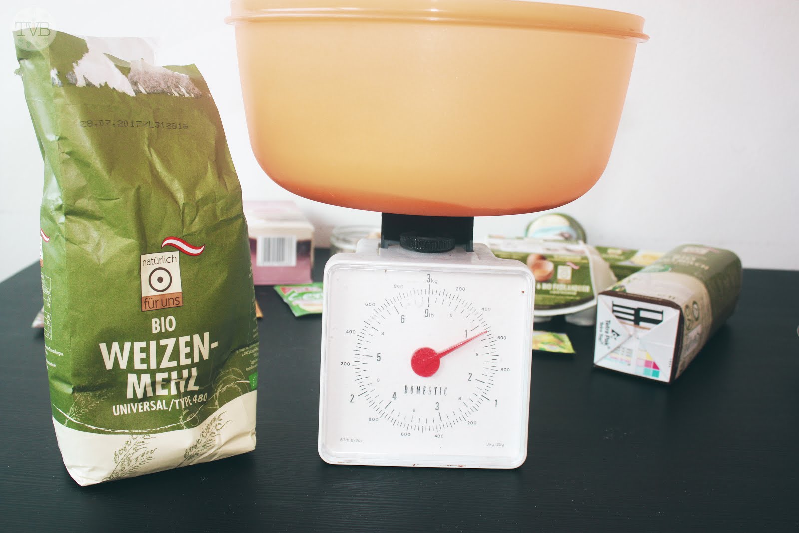 Wir mischen in einer Schüssel die trockenen Zutaten zusammen (Mehl, Salz,