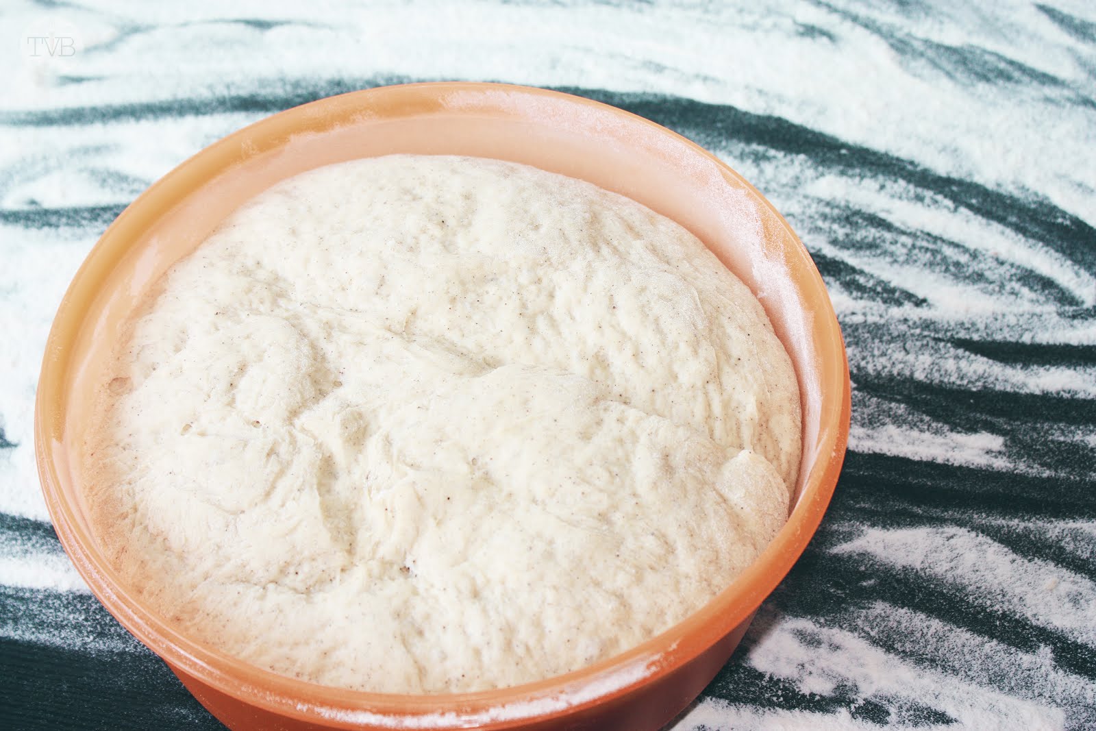 Wenn der Teig nun lang genug gerastet hat, nehmt ihn aus der Schüssel, knetet