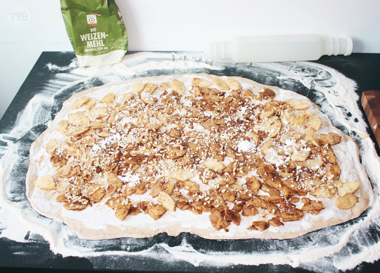 Streicht zuerst den Topfen drauf und dann verteilt die Äpfel darauf, bestreut