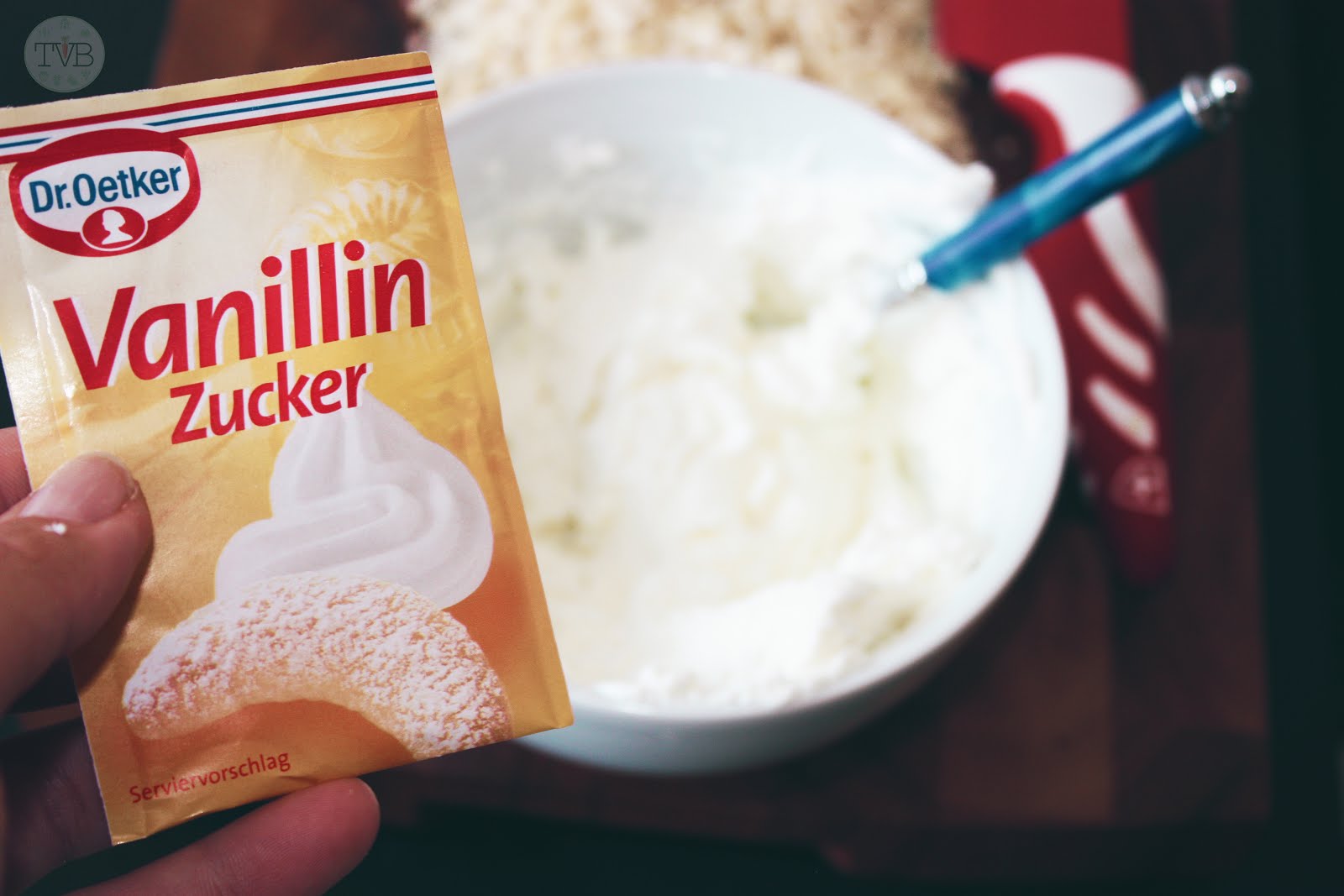 Schüssel zusammen rühren. Den Topfen mit 1 TL Vanillezucker glatt verrühren.