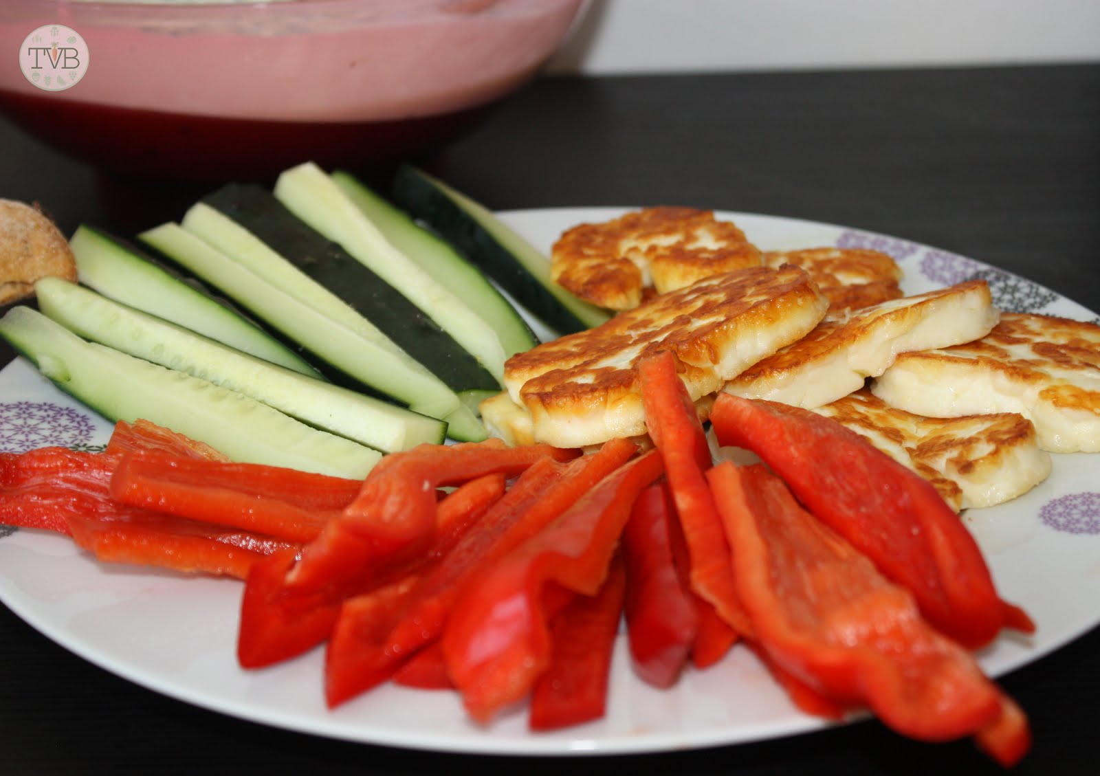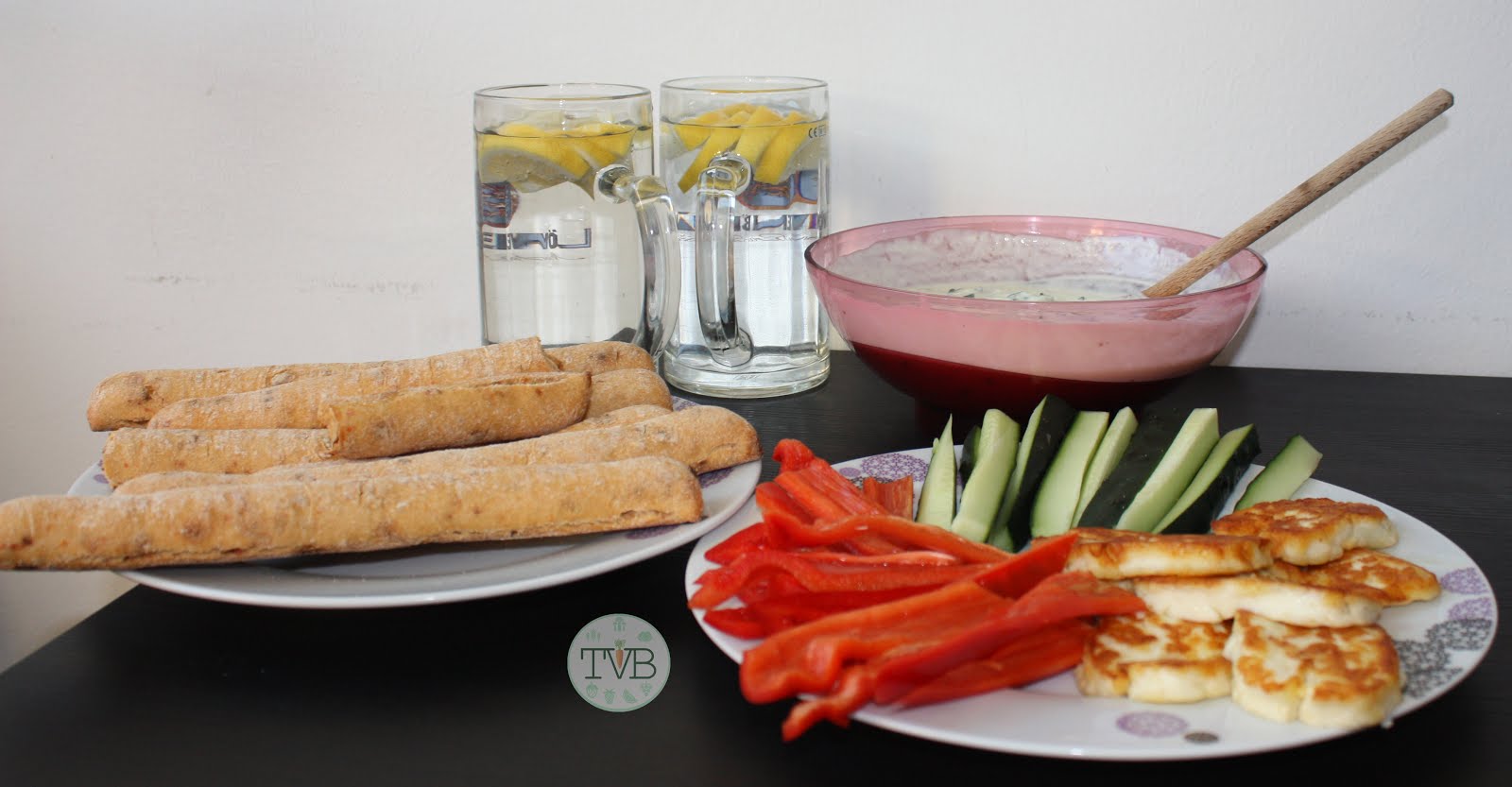 Das Brot habe ich im Ofen aufgebacken und den Halloumi in der Pfanne angebraten. Das restliche Gemüse in Sticks geschnitten und alles auf einen Teller angerichtet.