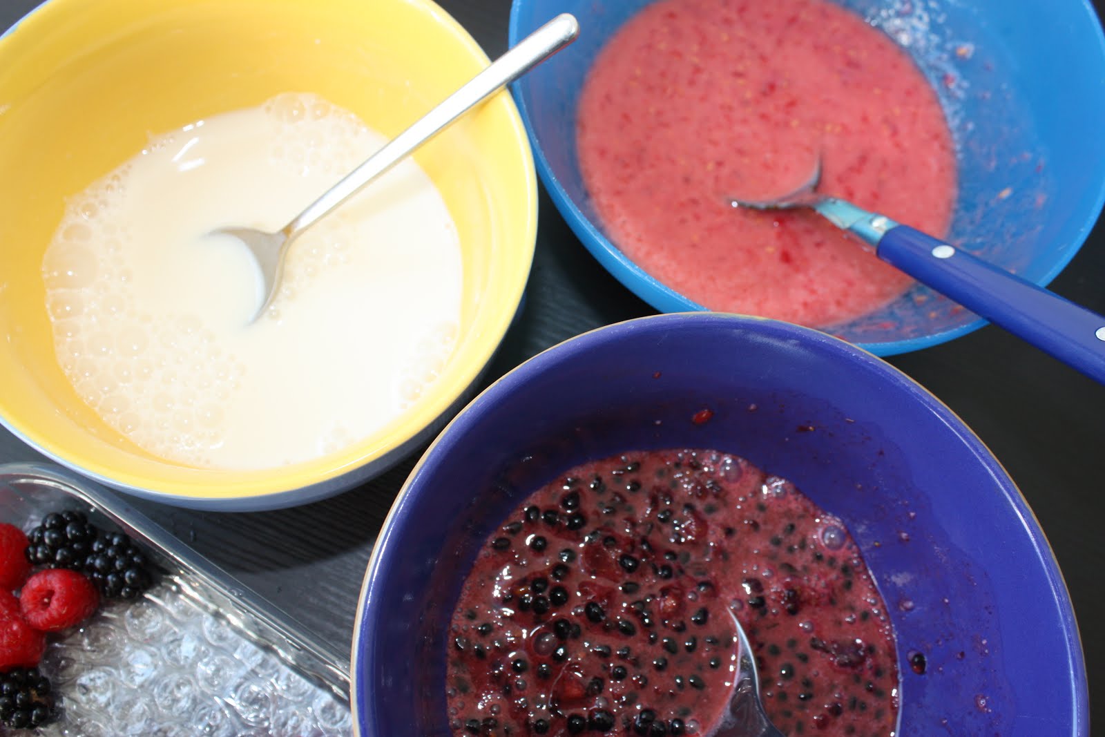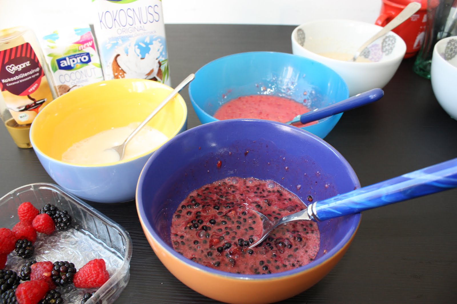 Als Erstes habe ich die Früchte püriert, mit Mandeldrink gestreckt und wenn nötig etwas gesüßt. Dann habe ich noch den Mandeldrink in eine Schüssel gegeben. Den habe ich nicht mehr gesüßt weil ich finde das dieser schon süß genug ist.