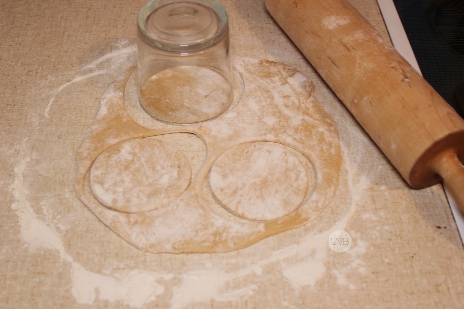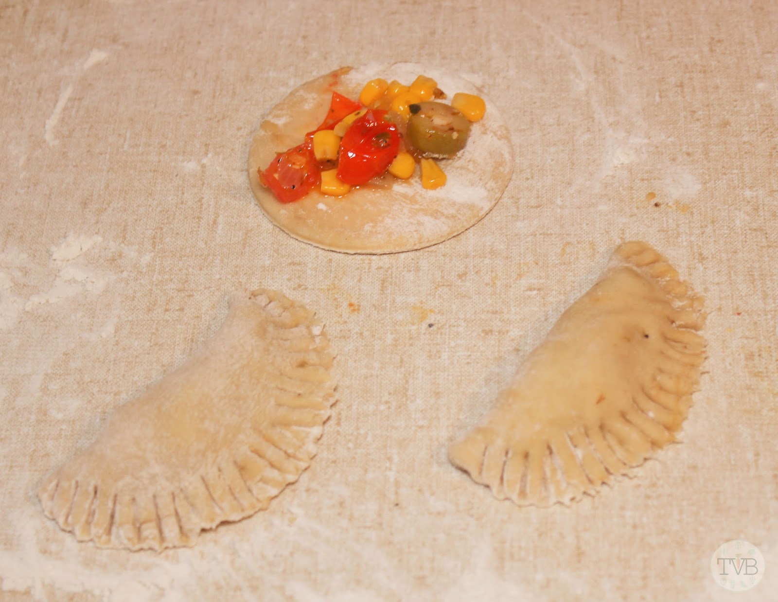 Stellt die fertige Fülle zur Seite und lässt sie etwas abkühlen. In der Zwischenzeit rollt ihr den Teig aus und stecht euch Kreise in belieber Größe aus. Diese füllt ihr dann mit 1-2 Esslöffel der fülle und klappt sie zusammen. Damit das ganze auch hält, drückt die enden mit einer Gabel zusammen.